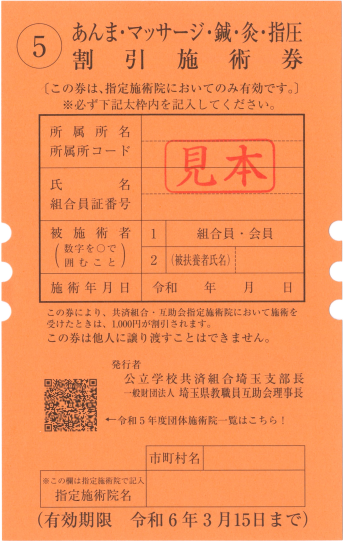 県職員共済組合、公立学校共済組合、市町村職員共済組合に加入されている方はそれぞれの保険者から はり・きゅう・あん摩マッサージ指圧の施術に使える割引券が支給されます。